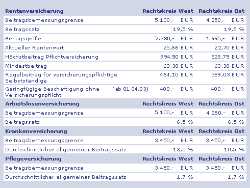 - Im Osten und Westen gelten verschiedene Bezugsgrößen (zum Beispiel beträgt sie im Jahr 2003 im Westen jährlich 28.560 EUR/monatlich 2.380 EUR; im Osten jährlich 23.940 EUR/monatlich 1.995 EUR). Siehe dazu auch "Regelbeitrag".